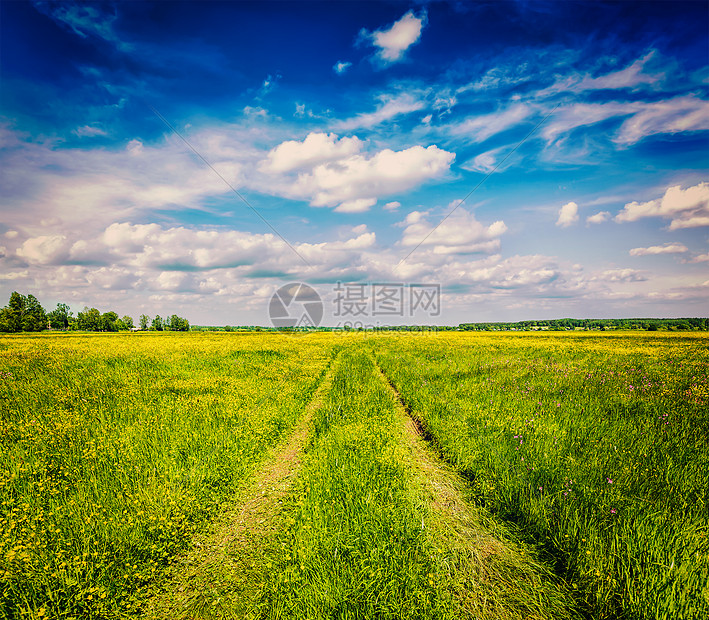 春夏背景复古效果过滤了乡村道路的时尚风格形象 绿草田 草甸风景 蓝蓝的天空春夏乡村道路绿野风光中的景观高清图片下载 正版图片 摄图网